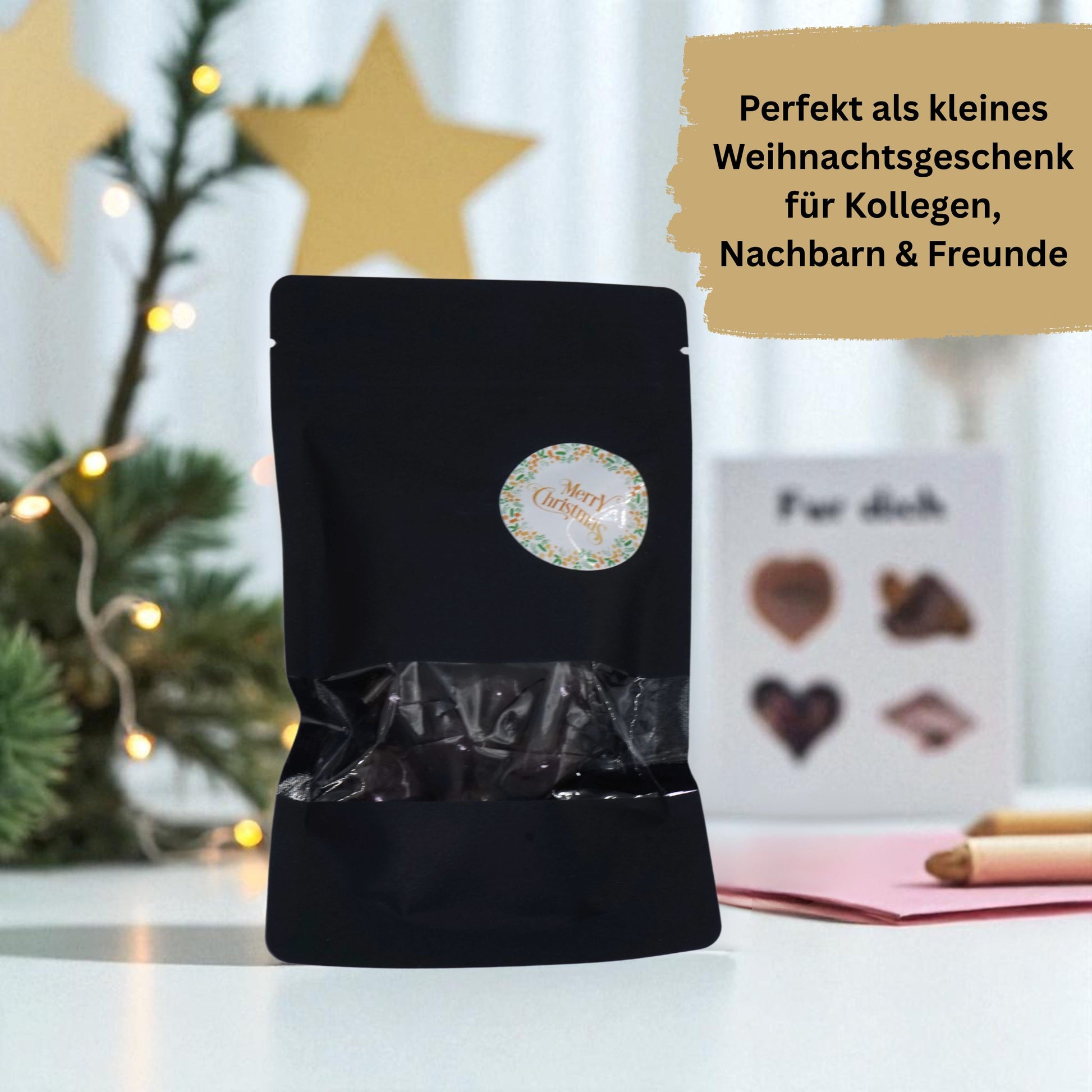 Inhalt je Tüte: 100 g Schokolade, frische Produktion, lange Haltbarkeit. Verpackt in schwarzer Tüte mit Merry Christmas Aufkleber – ideal als Mitbringsel oder zum Befüllen von Geschenkbeuteln und Adventskalendern.