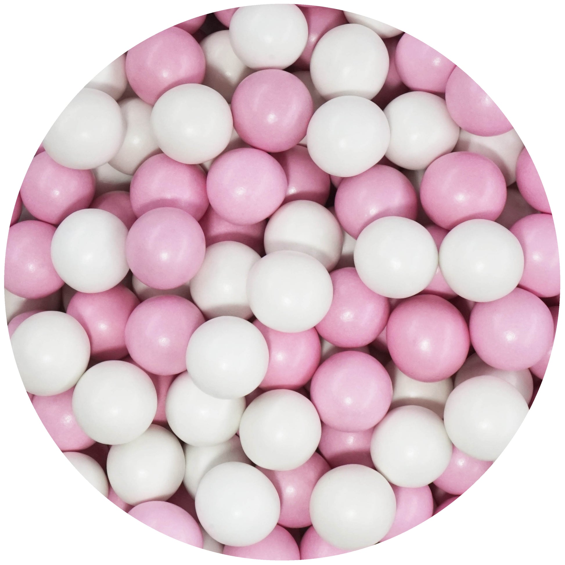 Diese ca. 180 edel glänzenden Crispy Schokokugeln in Weiß-Rosa Pearl vereinen zartschmelzende Milchschokolade mit einem knusprigen Kern und edler Zweifarb-Optik. Der perlmuttartige Schimmer in Weiß und Rosa macht sie zu einem echten Blickfang – ideal für Hochzeiten, Taufen, Kommunion, Konfirmation, Babyshower, Gender Reveal Partys, Candy Bars und Sweet Tables.