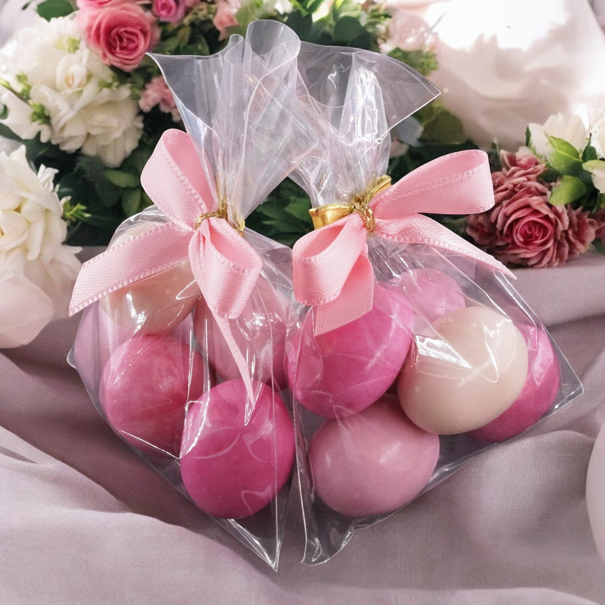 Diese 10 liebevoll gestalteten Gastgeschenke in Rosa und Pink enthalten jeweils 5 hochwertige Hochzeitsmandeln, gefüllt mit zartschmelzender Schokolade in vier fruchtigen Sorten: Kirsche, Erdbeere, Heidelbeere und Cheesecake. Sie verbinden moderne Aromen mit der traditionellen Symbolkraft klassischer Hochzeitsmandeln – ein Highlight für jede festliche Tafel.