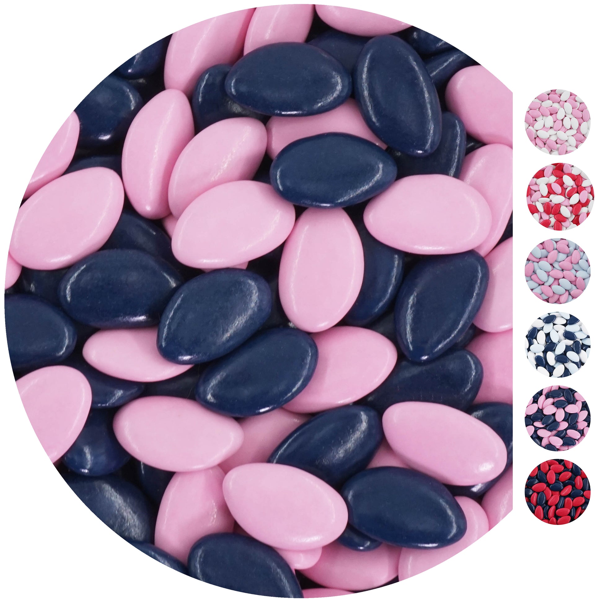 Diese Schokodragees in Rosa und Dunkelblau vereinen festliche Farben mit hochwertigem Geschmack. Mit einem Kern aus feiner Zartbitterschokolade und einer glänzenden Zuckerhülle werden sie zum geschmackvollen Highlight auf jeder Feier – perfekt als Gastgeschenk, für die Candybar oder den Sweet Table.