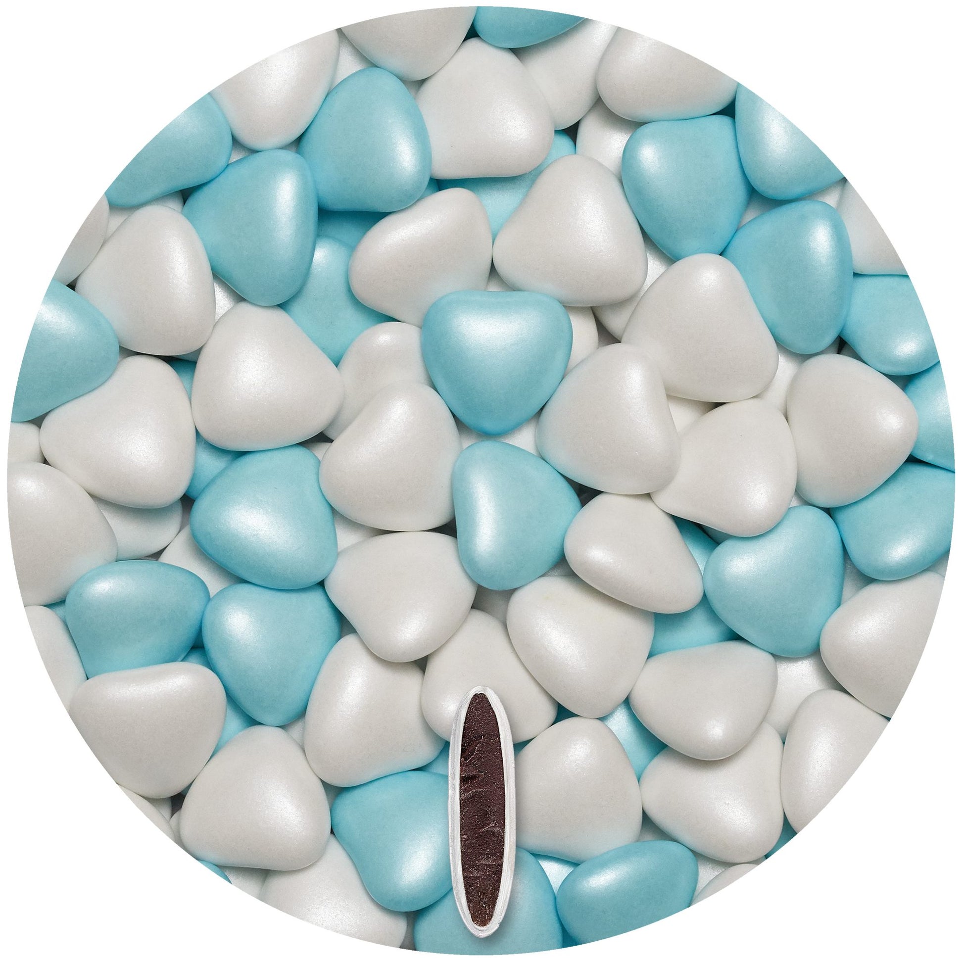 1kg Schokoherzen Dragees Mix medium weiss-hellblau pearl