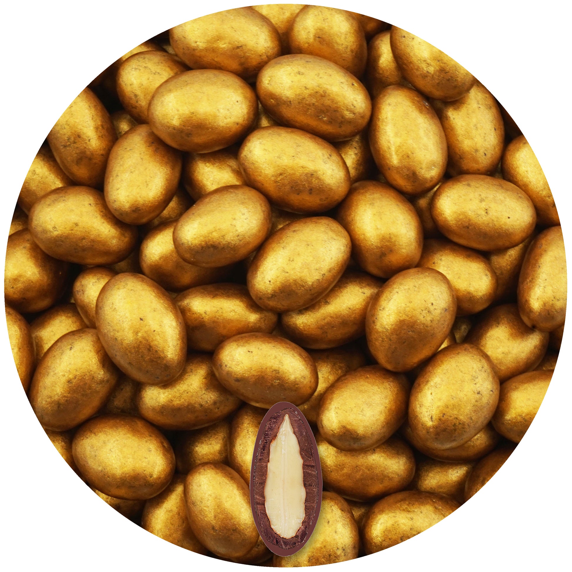 Innen eine knackige Mandel, außen zartschmelzende Vollmilchschokolade, umhüllt von einer goldfarbenen Zuckerhülle.