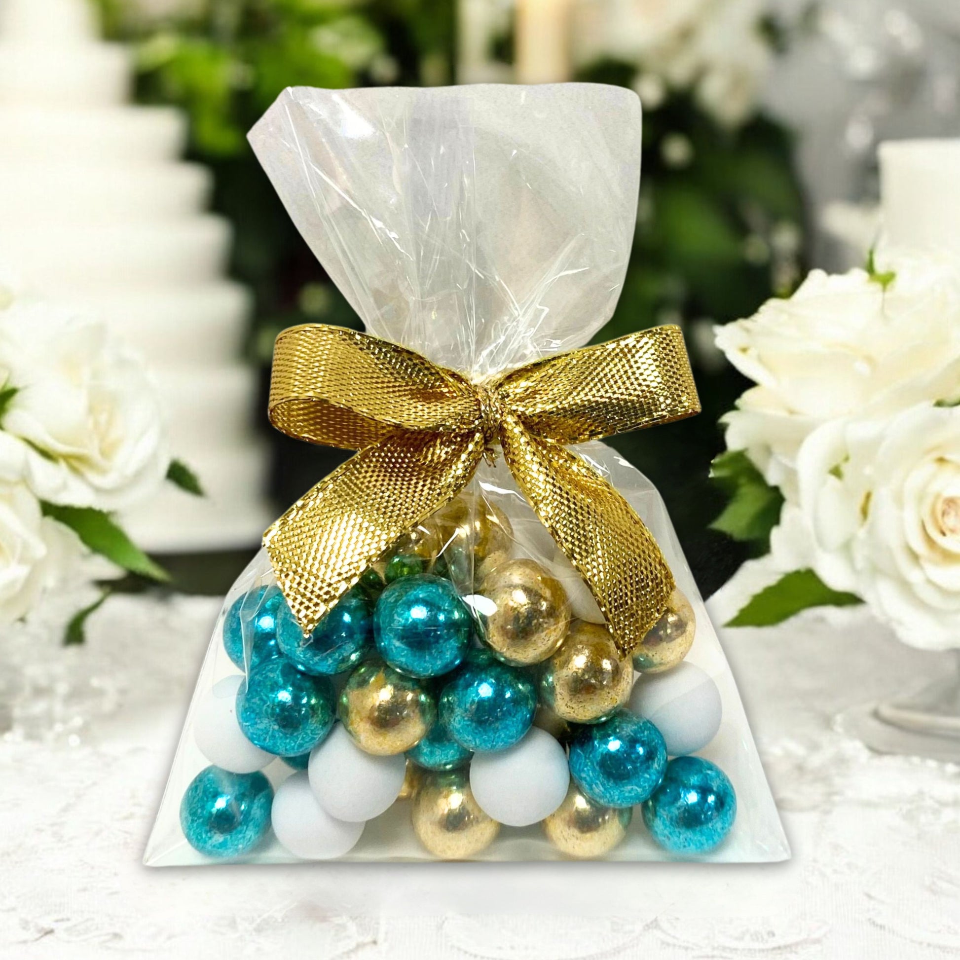 5 Stück kleine Gastgeschenke mit Schokokugeln weiss-gold-grün