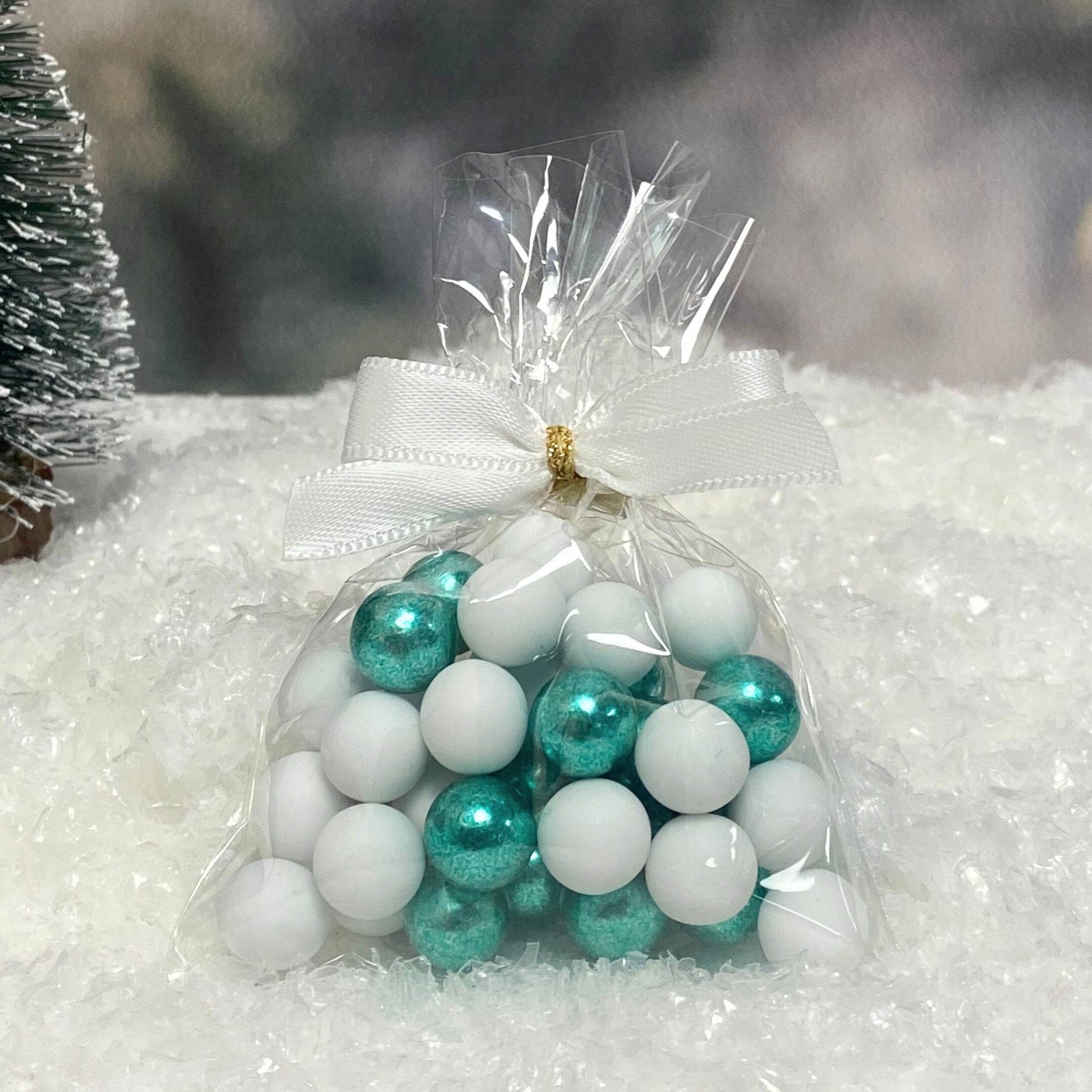 5 Stück kleine Gastgeschenke mit Schokokugeln weiss-grün